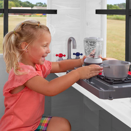 Ready for Fun: Includes play kitchen, powered blender, dinner bell, and functional half door to inspire imaginative play