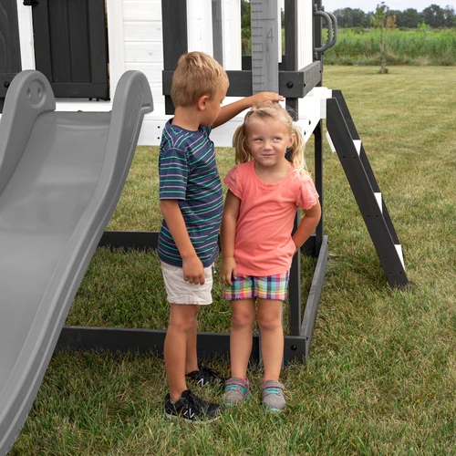 Raise the bar on backyard fun with the Sweetwater Heights Playhouse by Backyard Discovery. This elevated outdoor playhouse combines stylish charm with exciting play features, while being perfectly sized for any outdoor space. Kids will love exploring their very own clubhouse, complete with a wrap-around deck, wide step ladder, and wave slide. Inside this charming wooden playhouse, an interactive play kitchen inspires creativity with its toy stovetop, battery-powered appliances, built-in sink, and other accessories. The adorable working door and large windows allow plenty of natural sunlight and fresh air while making it easy to supervise playtime activities. Children of various ages can safely access their elevated retreat using the sturdy entry ladder with wide-rung steps. Make lasting memories by tracking your little ones’ growth with the attached measurement board. The versatile space beneath this backyard playset offers endless possibilities – create a fun sandbox area or use it for convenient toy storage. Crafted from naturally strong cedar wood and finished with sophisticated neutral colors, it provides striking beauty and long-lasting durability for many years of outdoor adventures. The Sweetwater Heights combines a traditional kids playhouse with elevated fun, creating the perfect space for endless childhood memories and active outdoor play.