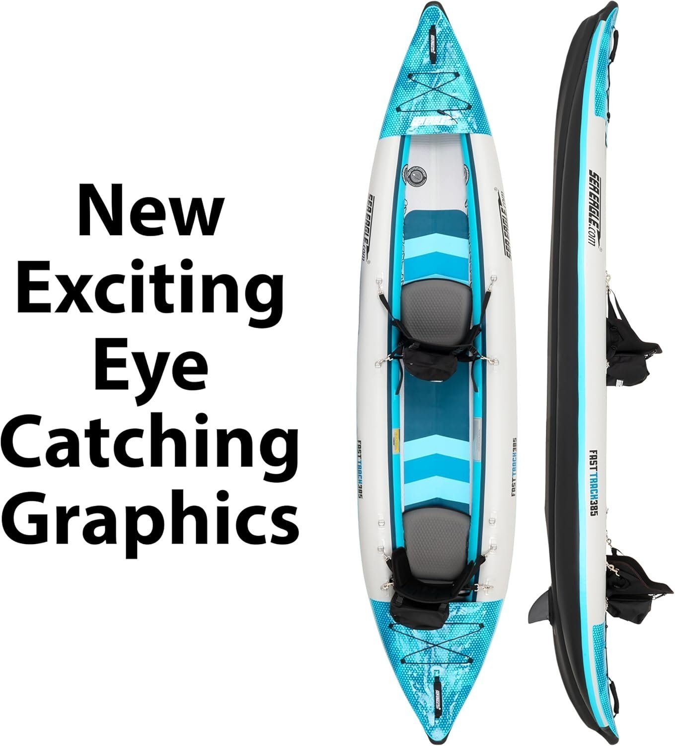 The Newly Redesigned Sea Eagle 385ft FastTrack™ V-Bottom inflatable kayak is better than ever! Featuring 3 separate independent safety air chambers, electrifying graphics, an attached rigid high-pressure V-bottom woven drop-stitch floor for lighter weight, greater rigidity, superior tracking, and paddling performance, a full-length non-slip EVA foam floor pad, front and rear spray skirts with storage below, and adjustable elastic rope lacing for additional storage above, conveniently located front, rear, and center side grab handles, and is now rated for up to Class III rapids!