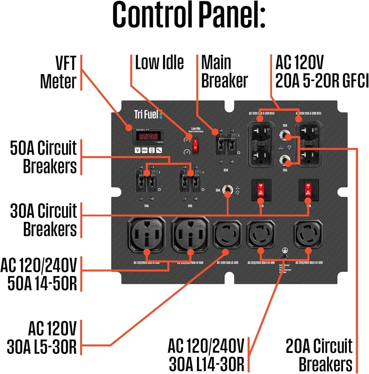 PLUG IN, POWER UP: Two 120/240V 14-50R 50A outlets, two 120/240V L14-30R 30A outlets, all transfer switch and interlock kit ready; one 120V L5-30R 30A outlet, four GFCI 120V 5–20R 20A standard duplex outlets; all have rubber covers; includes oil, funnel, and setup guide to get you going right away